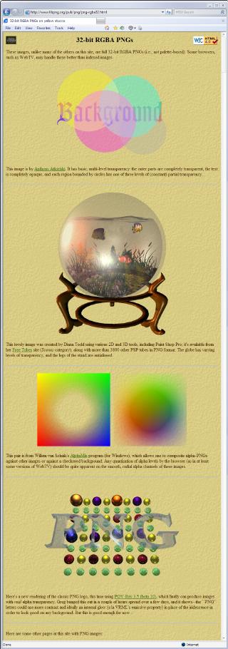 These are 40%-scale JPEG screenshots of the pngs-img.html, png-IceAlpha.html, png-MagnoliaAlpha.html, png-rgba32.html, and png-textures.html pages. They were taken by Michael Broschat using the first beta release of MS Internet Explorer 7.0 under Windows "Longhorn" Vista.